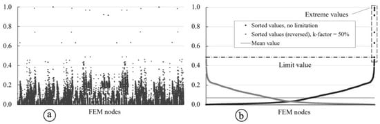 In Figure 8a, a general typical distribution of the FEM values for the internal forces in all nodes can be seen. The figure shows the normalized minimum and maxim values and the repetitive nature of the internal forces in FEM nodes within a TRC shell structure according to the basic idea shown in Figure 1 in a possible loaded state. Of course, each applied load results in a unique pattern of the internal force field. The figure shows a principal scheme of a possible distribution of internal force values. Now, the values of the internal forces were sorted according to their magnitude, which results in the diagram shown in Figure 8b (black dots). As can be seen, the extreme values are gathered on the right side of the diagram. Therefore, it is proposed to determine the mean value of all force’s values and then to indicate the values that are to be considered extreme values. The estimation is performed according to Equation (6):
