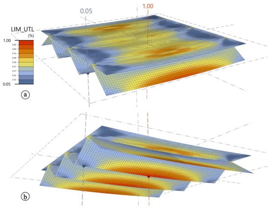 Figure 14a shows UR values for the uniaxial spanning structure G2.1 that possesses two directional orientations of the resolving membranes. The presented pattern shows a similar stress state in the main spanning direction but an almost low utilization of the bearing capacity of the material in regard to the transversal direction. Consequently, the transversal membrane brings a very minimal contribution to the general load-bearing capacity of the structure when supported on two opposite sides. The maximum possible load for this case reached the magnitude of 32.0 kN/m (line load) and of 172.8 kN (in total), respectively. Figure 14b shows the geometry G2.2 with two directional orientations and supports on all four sides (compare Table 3 and Figure 9). As can be seen from the figure, the bottom membranes of the structure experience a significant reduction in the stress magnitude. In addition, the UR diagram indicates the shift of the critical zone from the bottom side of the structure to the so-called nodal area according to Figure 10 in the connection areas to the vertical 5 cm thick TRC walls, which enclose the structure on the outside. Therefore, these nodal areas should be under special attention during the design process. A special design solution should be developed for these nodal areas according to the force flow in the next phases of the current research project to redistribute the peak values of the stress and, consequently, to achieve a more even redistribution of the stress state and the cross-sectional utilization within the whole structure. The maximum line load reached the magnitude of 60.0 kN/m, which resulted in a total load of 324.0 kN.