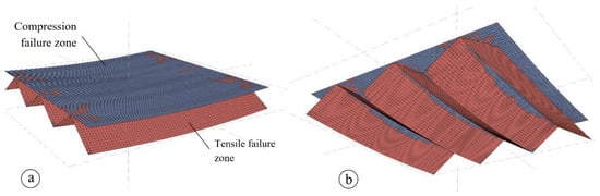 The hypothetical failure modes in the different areas of the TRC elements are represented in Figure 12a for the top view and in Figure 12b for the bottom view according to the failure type description given in Section 2.5. The used algorithm analyzes all FEM points, and therefore the results are provided for the whole structure. Thus, for the areas that are not subjected to their specific failure loads according to the results from Figure 11, the pictures indicate the potential failure mode if the load is increased over the level of the global failure load of the whole structure.
