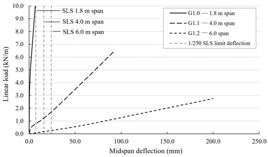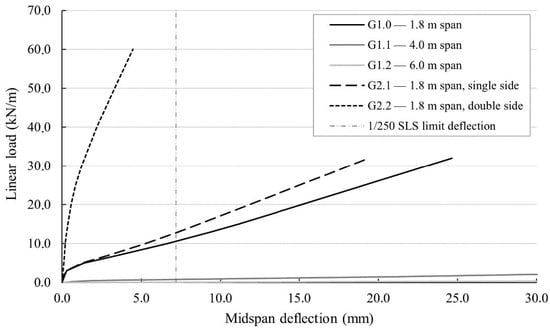 Load–midspan deflection relation of the elements with G1 geometry with differing spans from 1.8 m to 6.0 m; SLS limits according to [31] are added. Graphic: Iurii Vakaliuk.