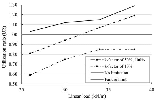 Taking limitation levels of 100% and of 50% into account, which corresponds to k-factors of 1.0 and 0.5, respectively, the UR levels are similarly reduced in general but increase steadily with rising applied linear load. The black dashed/dotted line results when the k-value is set to 0.1. As expected, the limitation of 10% shows a significant reduction in the UR level. At none of the FEM nodes one of the failure criteria was reached. In addition, the rise of the utilization ratio stagnates after exceeding a line load of approximately 35 kN/m, which can be interpreted as some “instability” in the estimation of the UR. The level of 10% seems to be too low, and, as a result, the algorithm trims “natural” gaps in the stress level between neighboring FEM nodes, according to the description from Section 2.6. Consequently, with k = 0.1, it was impossible for the iterative calculation to reach 100% of UR and to correctly estimate the failure limit.