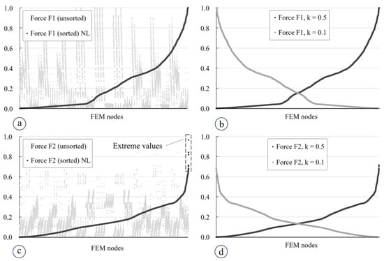 where is the force value in the neighboring FEM node. The -factor determines a fraction of the mean value to be used during further analysis. As can be seen from Figure 8b, once the values were categorized as extreme values, they were adjusted to the last maximum value determined during the evaluation process in Equation (6). Thus, the adjusted values provided in Figure 8b (grey dots) in reversed way for a clearer presentation.