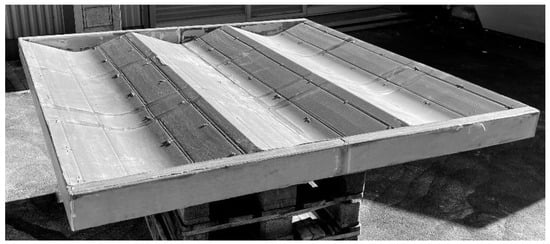 The thickness of all the internal and external membranes was set to 10 mm. The areas where it was planned to have the linear supports have thicker 50 mm walls. These dimensions are reflected, of course, in the FEM model. The other important point to be mentioned is the formation of the internal voids within the TRC elements. According to the scope of our research project, it is planned to manufacture und test such elements described here in our laboratory. The manufacturing process is carried out by casting under negative pressure. With this method, we cannot realize real voids in the desired geometry. To approximate the theoretical found shape, the voids are formed with specially cut blocks made of extruded polystyrene (XPS). In more detail, the whole procedure is described in [20]. The consideration of the XPS blocks within the FEM model was skipped for simplification reasons. It can be assumed that the load-bearing behavior of the elements is not fundamentally influenced. In a preliminary study as part of a master’s thesis [35], the influence of XPS and wax (see, e.g., [36,37]) instead of real voids was analyzed on a beam with hollows. The use of XPS in the voids only marginally influenced the load-deflection behavior of the member. As expected, the use of wax resulted in significantly stiffer behavior.
