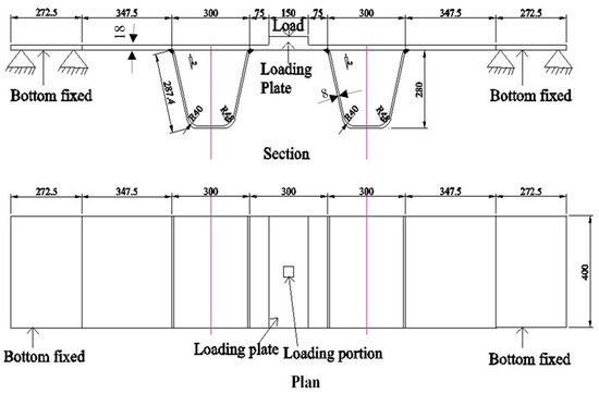 Illustration of load and boundary condition of double-ribbed specimen. The pink lines represent the centerlines of the closed stiffeners.