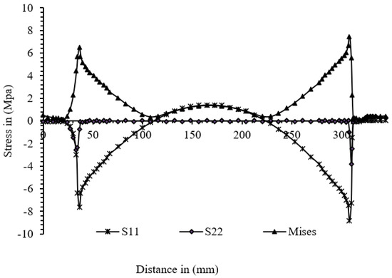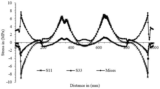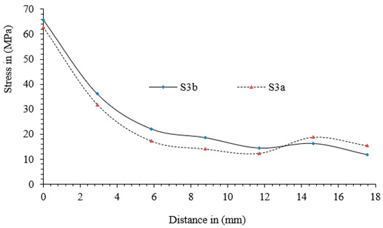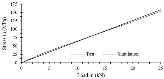 Similarly, the results of S3a model from simulation were compared with the stress generated from laboratory test reported by K C [23] and are plotted in Figure 15. The average percentage difference between the test results from simulation and test was 2.9%, which demonstrated that the simulated results were consistent with the test results.