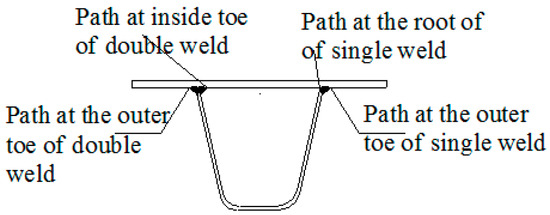 Table 6 demonstrates that the stress concentration at the toe in the rib is higher in case of a single-welded connection, but the stress is much lower than at the weld toe in deck in Table 5, where the stress concentration due to double welds is higher than the stress concentration due to a single weld, so the failure is more likely to occur at the deck than at the rib. Similarly, the stress concentrated by 8 mm ribs is always higher than stress concentrated by the 6 mm rib, as shown in Table 5 and Table 6.