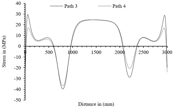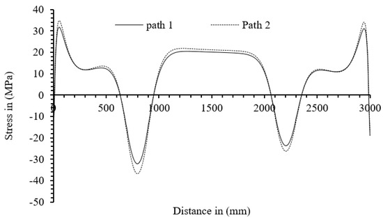 For load case 2, the extreme values of stress collected at different paths along the weld (Figure 9) are tabulated in Table 7.
