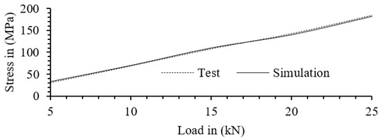 For the validation of results from simulation, the results of S2a model f from simulation were compared with the stress generated from laboratory test results reported by Zhu et al. [24] and are plotted in Figure 14. The average percentage difference between the test results from simulation and test was 3.8%, which demonstrates that the simulated results were consistent with the test results.