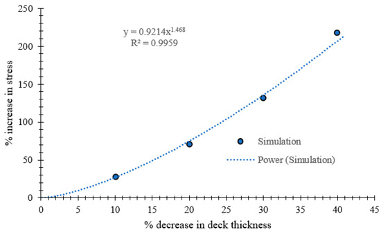 From the extensive simulation of different models, it was found that the increase in weld penetration increases the stress concentration slightly, which is similar to the findings by Dung et al. [17] and Mori [18]. Double welds at rib to deck connection can increase stress concentration slightly, which is more dependent on the thickness of the rib and deck. In addition, it was found that the stress concentration on a double-welded connection is higher if the deck and rib thickness is higher. Furthermore, it was found that the increase in rib thickness increases the stress concentration and decrease in rib thickness decreases the stress concentration, which is similar to the findings by Nagy et al. [20]. Among the examined parameters, the most important component that influences the fatigue life of OSD at the rib-to-deck connection was deck thickness. Considering the standard thickness of deck as 20 mm, a power relationship of percentage increase in stress concentration (y) and percentage decrease in deck thickness (x) was determined. The mathematical relation is given in Equation (2) which has the coefficient of determination (R2) of 0.9959. The relationship of stress concentration with decrease in deck thickness is also illustrated in Figure 16.