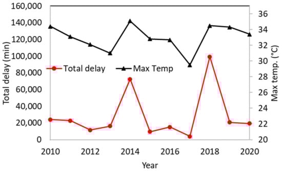 The total delay of Swedish rail traffic due to the occurrence of lateral track buckling and the corresponding maximum air temperatures during the period of 2010–2020.
