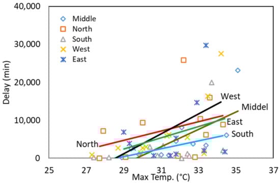 Based on data from the STA, Sweden’s rail network experienced more than 998 instances of lateral track buckling between 2008 and 2022 [11]. These occurrences are found to be highly dependent on temperature fluctuations [11]. Figure 2 displays the total train delays attributed to lateral track buckling incidents between 2010 and 2020, alongside the corresponding maximum air temperatures in Sweden during the same period. Train delay data were extracted from the Swedish Transport Administration’s database, Ofelia [23], and air temperature data were obtained from the Swedish Meteorological and Hydrological Institute (SMHI) [35]. A clear relationship between train delays caused by lateral track buckling and maximum air temperatures is observed. In Figure 3, train delays versus maximum air temperatures is shown for five different regions (north, south, middle, west, and east) individually. Notably, in all regions, an increase in maximum air temperature corresponds to an increase in the risk of lateral track buckling.