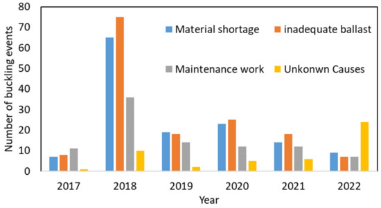 Historically, the primary causes of lateral track buckling incidents in Sweden have been identified as (i) inadequate ballast, (ii) material shortage or other deviations such as incorrect or unknown stress-free temperatures, incorrect insulated rail joints, absence or damage to track components (rail, fastenings and sleepers), and significant lateral track irregularity, and (iii) maintenance work that can impact rail track stability or alter stress-free temperatures [19]. Figure 4 shows the causes of lateral track buckling in Sweden between 2017 and 2022 [11,15,16,17,18,19]. As can be seen, inadequate ballast was consistently identified as the primary cause of track buckling incidents in 2018, 2020, and 2021. In 2017, maintenance work was the primary cause and, in 2019, material shortages took precedence. Interestingly, in 2022, none of these causes emerged as the predominant reason, highlighting the need for future research to gain a deeper understanding of lateral track buckling issues in Sweden.