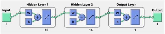 A feedforward network architecture was selected as it is one of the most common neural network types. The developed ANN model contains 2 hidden layers. The number of neurons in each hidden layer is 16. The TANSIG (hyperbolic tangent) function was used as the activation function for neurons in both layers. The architecture of the developed neural networks is shown schematically in Figure 1.