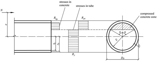 When generating a dataset for training, the provisions presented in the Russian design codes for composite steel and concrete structures SR 266.1325800.2016 [30] were used. Columns without bar reinforcement were considered, in which only a steel pipe acts as a reinforcement. When determining the breaking load, the stress diagrams in concrete and steel in the limit state were assumed to be rectangular; the work of tensile concrete was not taken into account. The diagram for determining the ultimate load under eccentric compression of a CFST column is shown in Figure 2.