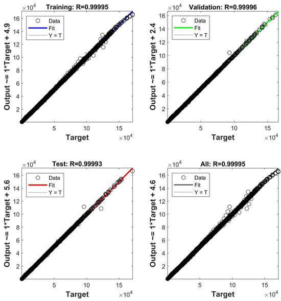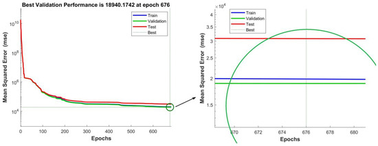 Figure 3 shows the training performance graph for the model trained on ultimate loads without taking into account additional random eccentricities. Figure 4 is the same for the model trained taking into account additional random eccentricities. In the first case, the learning process took 474 epochs, and in the second case, it took 682 epochs. The model trained without taking into account additional random eccentricities is characterized by a four-times-smaller MSE value: 4693 vs. 18,940. The MSE values for the “Train”, “Validation” and “Test” parts of the sample are almost the same: the blue, green and red lines overlap each other. A small difference in MSE for the “Train”, “Validation” and “Test” parts of the sample indicates its sufficient volume.