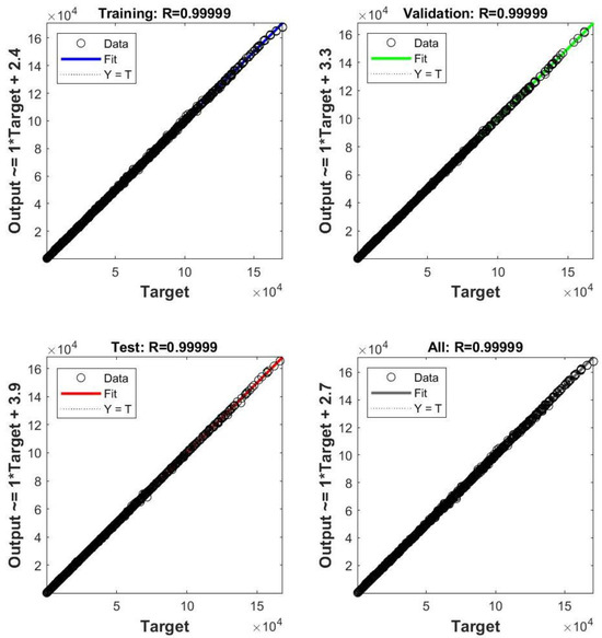 During training, the sample was randomly divided into 3 parts: “Train”, “Validation” and “Test” in the proportion of 70%, 15% and 15%. To train the ANN, we used the Levenberg–Marquardt algorithm. The value of the mean square error (MSE) was taken as a criterion for the quality of training: