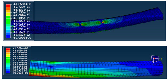 The mid-span deflection and longitudinal strain at the top and bottom of the tubes in the maximum moment region were compared to the experimental results (Table 4). Failure modes of the CFFT beams are presented in Figure 4, which are in agreement with those reported by [16]. The estimated load and deflection results at failure of the three beams agreed with the experimental results well, as shown in Figure 5 and Figure 6, but some discrepancies were observed with respect to ultimate strains for Beam 1 and Beam 3. Possible reasons for the error might be the slip between the tube and the concrete core that occurred during the experiments that was neglected during the finite element analysis. Other possible reasons for the observed error include inaccuracies associated with the selected constitutive models for the constituent materials and/or contact interactions as well as possible local damage in the FRP tube that was not captured by the model.
