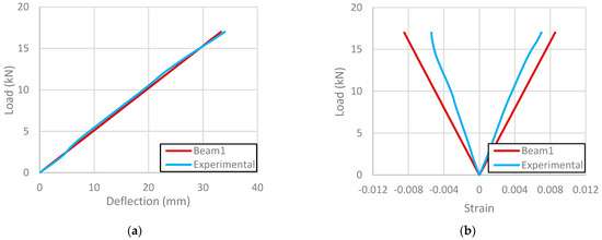 Beam 1 (a) load–deflection relationship and (b) load–axial strain relationship.