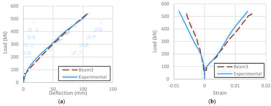 Beam 3 (a) load–deflection relationship and (b) load–axial strain relationship.