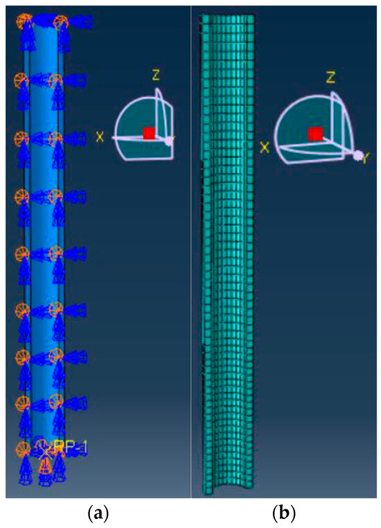 In order to improve computational efficiency, towers that were loaded concentrically were modeled with a symmetry condition as shown in Figure 8a. Symmetry was enforced along the x-z plane by restricting translation in the y-direction as well as rotation in the x- and z-directions. The bottom surface of the tower model was fixed using reference point RP1, which means all six degrees of freedom were restricted.