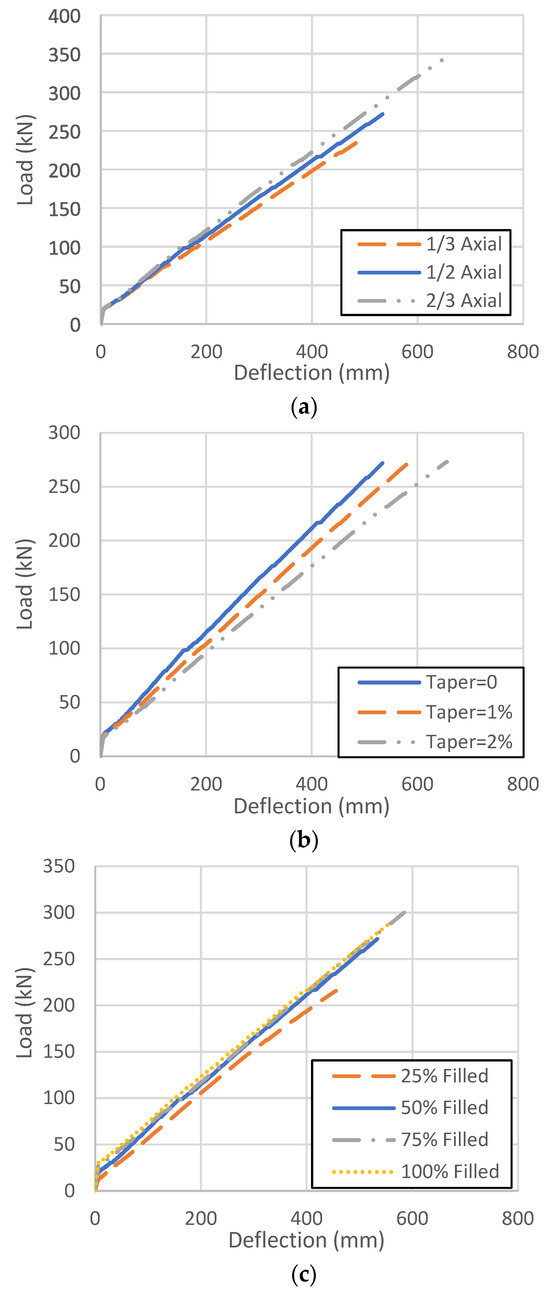 - The taper ratio only influences the stiffness of CFFT models and does not affect the load capacity. The use of tapered tubes is useful to facilitate segmental construction since tube segments can be “stacked” to achieve desired tower heights (the design of these segmental connections is outside the scope of the present study).