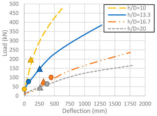 - Increasing the h/D ratio decreases the load capacity and increases the displacement at failure. Though the deflection limit differs for different model heights, the load at the deflection limit decreases with the increase in the h/D ratio. Based on the tower configurations considered in this study, a preliminary design of a CFFT wind turbine tower is recommended to have an approximately 15 h/D ratio, 2% taper ratio, 50% concrete filling ratio, 10 mm GFRP tube thickness, and 2% steel reinforcement ratio. The prestressing level and other parameters can be refined based on the calculated wind loads and other salient factors such as location and turbine size.