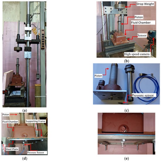 Drop weight testing setup. (a) Drop weight apparatus; (b) Different components of stress wave generator PCB Piezotronics Pressure sensor; (c) Piston and tube pressure testing; (d) Chamber pressure testing with steel plate; (e) Chamber pressure testing with aluminum plate.