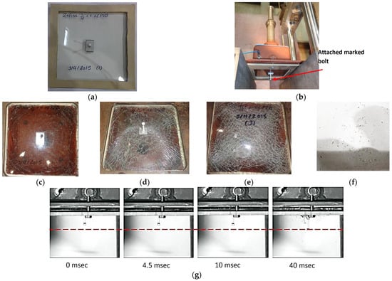 Testing of LG panels by using the dynamic stress wave generator before and after failure. (a) Sample #1 before the test; (b) Sample #1 attached to the wave generator; (c) Failed sample #1; (d) Failed sample 2; (e) Failed sample 3; (f) Flaying glass shards; (g) Selected frames from the high-speed video (The dotted line is a reference line to show the deflection at the certain selected times).