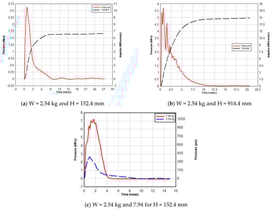 Figure 4a shows the pressure-time history and impulse inside the fluid chamber using a 2.54 kg drop weight at a height of 914 mm. The rise time for the pressure was approximately 10.6 ms, which was higher than the rise time for the pressure in the piston itself, around 0.23 ms (Figure 4a). On the other hand, as depicted in Figure 4b, the impulse inside the fluid chamber was 1.3 times the impulse inside the piston for the same height and mass of the striker. This indicates that although the final pressure decreased and the rise time increased when using a fluid chamber, the impulse transmitted through the fluid remained the same or even higher. Figure 4c illustrates the pressure-time history inside the small water chamber using striker masses of W = 4.35 kg and 2.54 kg at three different heights of H = 304.8 mm, 609.6 mm, and 914.4 mm. The results show that the pressure increases when the height, and consequently the striker speed, increases at the same weight. Additionally, the pressure increases when the mass of the striker increases at the same height.