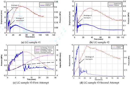 Figure 7a displays the pressure-time history and displacement-time history for the first LG panel. There were two drops in the displacement-time curve, indicating that the outer annealed glass layer (loaded side) broke at 4.2 ms, followed by the inner annealed glass layer at 9.7 ms. Corresponding to these drops in displacement, there were two drops in the pressure-time curve. The breakage of the glass allowed the panel to absorb the shock wave energy, causing the pressure value to drop instantaneously at 4.2 ms and 9.7 ms. The impulses that caused the first and second layers to break were 0.97 MPa-ms and 1.81 MPa-ms, respectively.