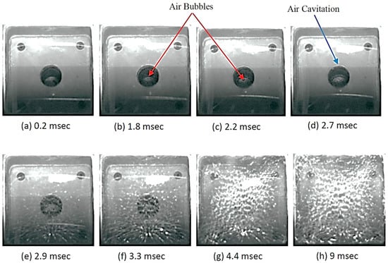 Figure 9a depicts the LG specimen attached to the fluid chamber at 0.2 ms. In Figure 9b, it can be observed that as the specimen began to deflect, bubbles formed in the water near the end of the piston region at 1.8 ms. Defining the exact position of the bubbles was challenging due to the lack of a side-view video recording for the test. Figure 9c illustrates that as the specimen deflected further, the bubbles increased in size, forming a cavitation area at the junction between the piston and the fluid chamber. In Figure 9d, it can be seen that the bubbles started to collapse, and the cavitation area around the piston expanded. Figure 9e shows the first crack that developed in the outer annealed glass layer of the LG pane at 2.9 ms. Figure 9f depicts the propagation of cracks in the outer annealed glass layer of the LG pane. Figure 9g captures the initial failure of the inner annealed glass layer of the LG pane at 4.4 ms, accompanied by a drop in pressure similar to that shown in Figure 7b. Finally, Figure 9h reveals that cracks in the glass plies became denser near the maximum deflection at 9 ms.