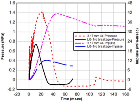 Comparison between pressure-time and impulse history for 3.17 mm aluminum plate and LG sample # 3 (no breakage pressure) using 7.94 kg weight at 1524 mm height.
