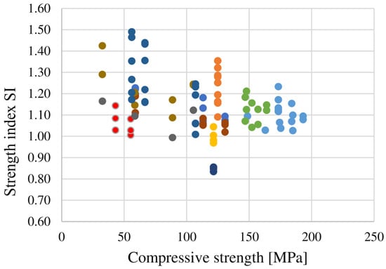 Relation between the strength index (SI) and the concrete compressive strength, according to references [,,,,,,,].