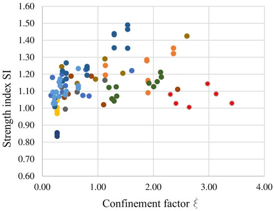 Figure 1 depicts the relationship between the strength index and the compressive strength of concrete. The values were obtained from previous studies [,,,,,,,]. The results demonstrated that higher strength index (SI) values were observed for NSC. Conversely, lower SI values were obtained for HSC and UHSC. This observation is typical for confined concrete, and it is also observed when fiber-reinforced polymers (FRP) elements are used [,,]. However, a distortion in the SI values can be observed for the same values of compressive strength, which indicates that the compressive strength does not determine the mechanical behavior of the CFST elements. Figure 2 shows the relationship between the strength index SI and the confinement factor (ξ). It can be observed that the strength index increases with an increase in the confinement factor. However, similar to the case above, a distortion in the SI values was observed for the same values of the confinement factor.