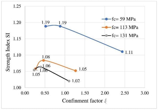 Relation between the strength index (SI) and the confinement factor (ξ), according to the results of [].