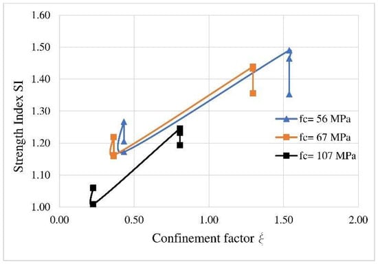 Relation between the strength index and the confinement factor, according to references [,,,,,,,].