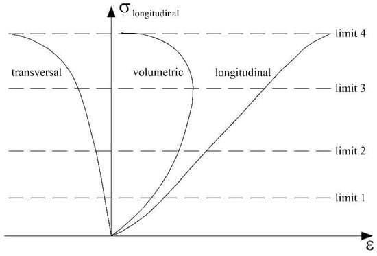 In the case of uniaxial compression tests of high-strength granite cylinders (height/diameter ratio h/d = 2), the measurement of strains and counting the acoustic events (indications of cracking) can enable the detection of the following limits of phases during internal destruction [,], (Figure 12): Limit 1: the end of closing of pre-existing microcracks with favorable orientation (non-parallel to the applied loading). Limit 2: the formation of new longitudinal cracks with stable progression. Limit 3: the beginning of the unstable progression of longitudinal cracks. Limit 4 (fgk): failure due to the instability of the pillars or micro-pillars. Limits 2 and 3 can be considered as effective material properties due to their minor dependence upon external factors [,]. According to [], the utilization of similar measurement techniques such as the counting of acoustic events can determine a similar behavior for concrete. Limit 2 occurs at stress values in the range of 0.4–0.5 fck, and Limit 3 occurs at stress values in the range of 0.75–0.8 fck. These values are in the range of the values obtained for rocks [,,].