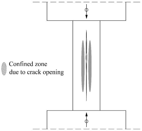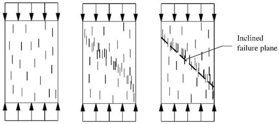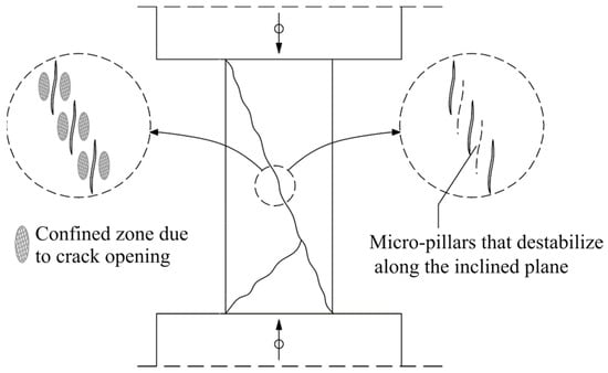 Failure in inclined planes is a relevant aspect of the behavior of compressed brittle materials. Although, failure in inclined planes is similar to that of shear failure, the process does not involve shear processes []. The inclined failure planes occur due to the instability of the material as a structural system composed of micro-pillars between cracks [] (Figure 13), depending upon the crack size, crack density, and loading conditions.
