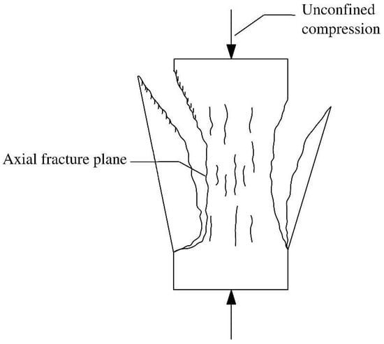 Failure in unconfined compression with separation in compact pieces after the formation of long cracks and the concentration of small cracks in some zones (adapted from []).