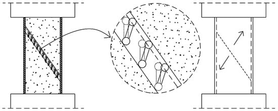 The idea of the inclined failure being composed of the micro-pillars between cracks also permits a better comprehension of the interaction between the concrete and the tube, explaining, for example, the diagonal fractures in the tubes, as shown in [,]. Under compressive loading, the micro-pillars rotate, producing inclined tensile forces in the tube and the observed diagonal fracture. That lateral action creates diagonal tensile stresses in the tube, whose value will depend on the micro-pillars’ compressive strength and their length, which inherently are related to the concrete composition and strength. One contribution of this work is the conceptual model shown in Figure 19, which can be developed in future numerical analyses of CFST solutions.