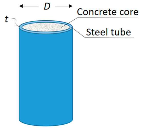 Steel members offer high tensile strength and ductility, while concrete members offer high compressive strength and stiffness. Composite members that combine steel and concrete offer the advantages of both materials [1,2]. The most widely used type of composite column is the concrete-filled steel tube (CFT) column (Figure 1), which consists of a steel tube filled with concrete. A CFT column can provide excellent seismic-resistant structural properties, including high strength, ductility, and energy absorption capacity.
