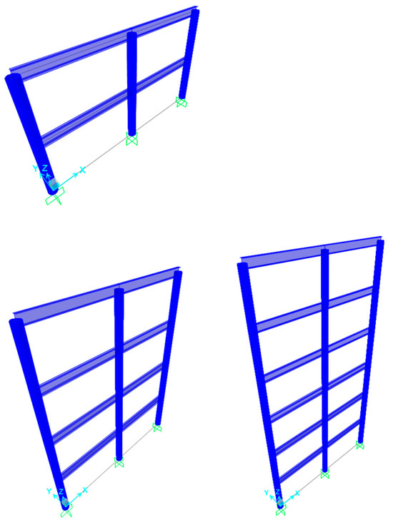 In this study, 2-, 4-, and 6-storey frames are examined (Figure 2). The floor height is equal to 3.0 m. The frames consist of two bays, and each bay has a span of 6 m. The structural frames in this study are designed in accordance with Eurocode-3 [19], Eurocode-4 [20], and Eurocode-8 [21] standards, utilizing SAP2000 [22]. Two load combinations are considered: a seismic combination and a gravity combination, according to Eurocode 8 [21]. The seismic load combination incorporates a vertical load of 25 kN/m on the beams, calculated as G + 0.3Q + E, where G is the dead load plus 0.3 times the live load (Q), in addition to the earthquake load (E). The gravity load combination applies a total load of 42 kN/m, calculated as 1.35G + 1.5Q.