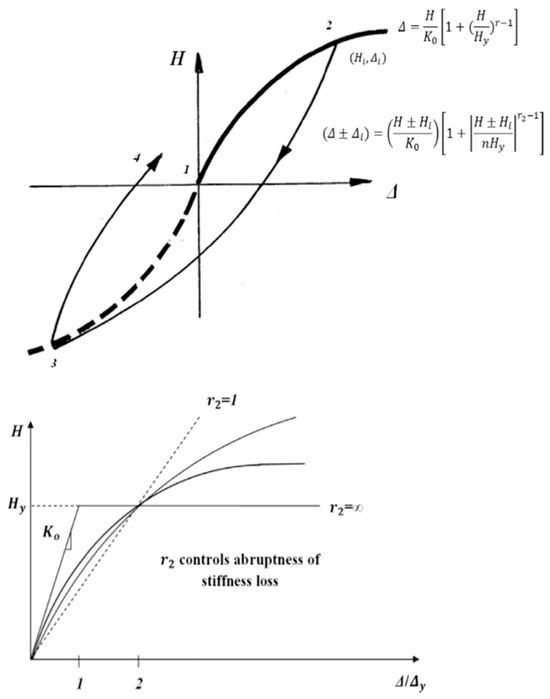 The behavior of composite columns is modeled using the modified Ramberg–Osgood model, according to Serras [23]. The Ramberg–Osgood model is employed to characterize load-displacement hysteresis curves, H-Δ, which exhibit an elastic portion up to the yield displacement Δy and the corresponding yield force Hy(=Fy), followed by a transition curve leading to a plastic state, as indicated in Figure 3. The transition from elastic to plastic behavior is influenced by the Ramberg–Osgood factor r2, as demonstrated in Figure 3. Serras [23] introduced a simple yet effective analytical model for the cyclic behavior and strength capacity of circular concrete-filled steel tube (CFT) columns under axial load and cyclically varying flexural loading. Based on this databank, empirical expressions are formulated to assess the phenomenological parameters of the well-known Ramberg–Osgood hysteretic model. Furthermore, empirical analytical relations are established to provide a direct and efficient representation of the ultimate strength of circular CFT columns, which are then validated. The inelastic behavior of the structure is analyzed by considering the potential formation of plastic hinges at the extremities of each member, which can be described using a bi-linear hysteresis mode. Regarding the modeling of nonlinearities of CFT columns in SAP2000, user-defined hinges that follow the modified Ramberg–Osgood hysteretic behavior are introduced. The nonlinear behavior of steel beams is modeled using plastic hinges that consider the number of cycles for the degradation of strength. More details can be found in the work of Kamaris et al. [24]. Diaphragm action is utilized to model the presence of composite slabs. It is expected that the composite floor slab diaphragms will transfer in-plane shear forces generated by earthquakes to the lateral load-resisting system. The distribution of these forces within a structure is contingent upon the diaphragm’s stiffness and strength.