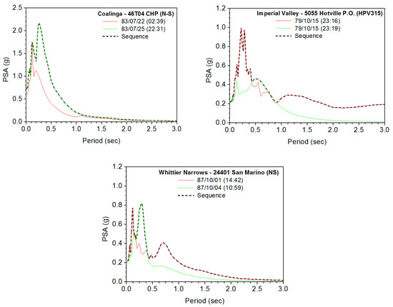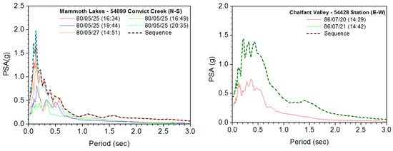 The comprehensive ground motion database utilized in this analysis consists of five genuine seismic sequences. These sequences were recorded over a limited duration, lasting up to three days, by the same station, in a consistent direction, and at nearly identical distances from the fault. The seismic sequences include the Mammoth Lakes (May 1980–5 events), Chalfant Valley (July 1986–2 events), Coalinga (July 1983–2 events), Imperial Valley (October 1979–2 events), and Whittier Narrows (October 1987–2 events) earthquakes. In Table 2, a thorough listing of the five seismic sequences employed in the analysis is provided. These sequences were captured by the Pacific Earthquake Engineering Research (PEER) Center [25]. The table encompasses the following details for each seismic sequence: the name of the earthquake event, the name of the strong motion recording station, the component of the ground motion record, the date and time of the earthquake event, the local magnitude (ML), the Arias intensity (Ia) of the ground motion, and the recorded peak ground acceleration (PGA).