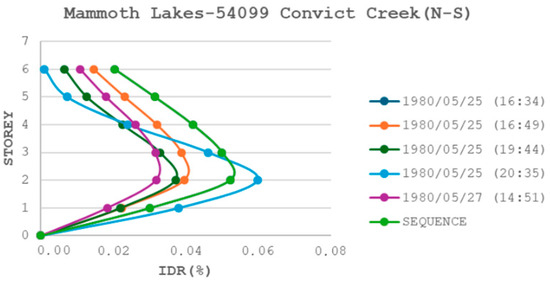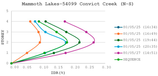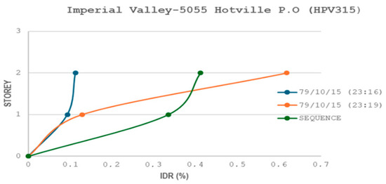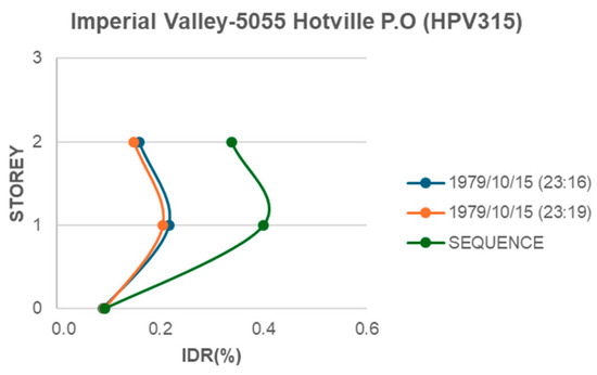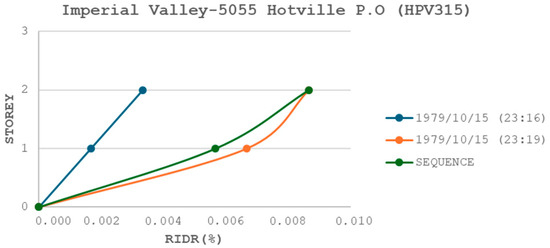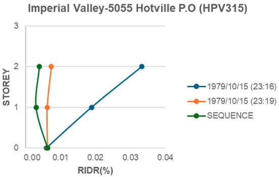 Figure 6 presents the maximum interstorey drift ratio of the 2-storey structure under single and sequential ground motion. It is interesting to note that this analysis has uncovered instances where a single seismic event resulted in a higher interstorey drift ratio (IDR) compared to a full sequential earthquake scenario. This unexpected outcome may be due to various factors: (i) Characteristics of the specific ground motions: The frequency content of the single event may closely match the natural frequency of the structure, leading to resonance and larger displacements; (ii) Energy dissipation: The initial event in a sequence may cause the structure to dissipate energy through minor damage or nonlinear behavior, potentially making it more resilient to subsequent shocks. This observation emphasizes the complexity of structural responses to seismic sequences and highlights the importance of considering both single and multiple event scenarios in seismic design.