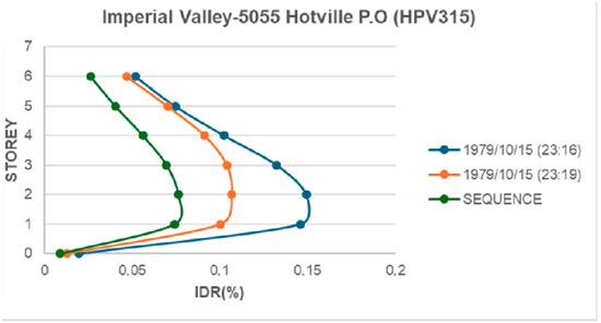 Maximum interstorey drift ratios (IDRs) under single and sequential ground motions (6-storey building founded on stiff soil).