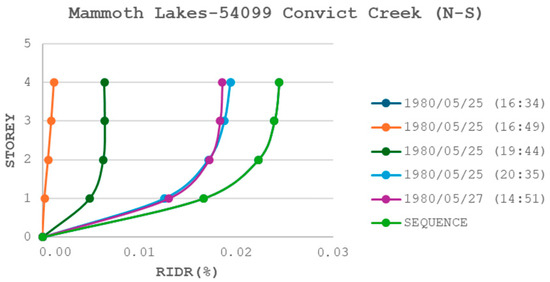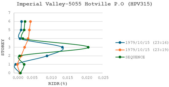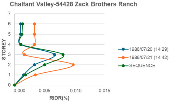 Residual interstorey drift ratios (RIDRs) under single and sequential ground motions (6-storey building founded on stiff soil).