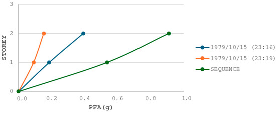 Peak floor acceleration (PFA) under single and sequential ground motions (2-storey building founded on stiff soil).