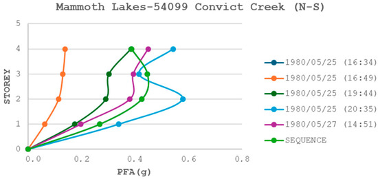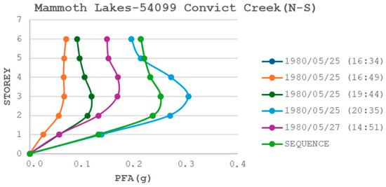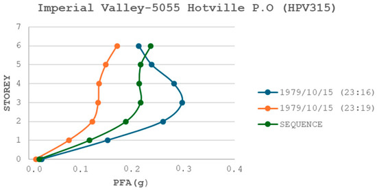 Peak floor acceleration (PFA) under single and sequential ground motions (6-storey building founded on stiff soil).