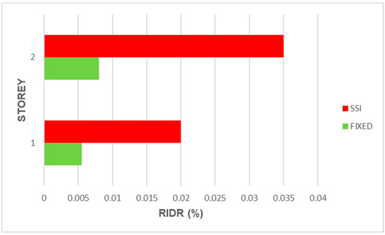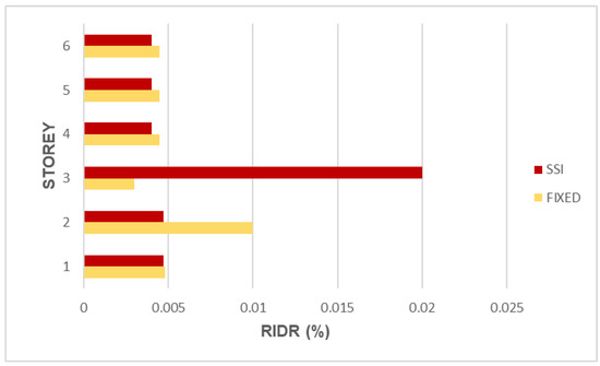 Figure 11, Figure 12 and Figure 13 present the residual interstorey drift ratio of the 2-, 4-and 6-storey structure, respectively, founded on stiff soil, under single and sequential motion. Figure 14 and Figure 15 present the residual interstorey drift ratio of the 2-and 6-storey structure, respectively, founded on compliant soil, under single and sequential motion. Analysis of the residual interstorey drift ratio (RIDR) across 2-, 4-, and 6-storey buildings reveals unexpected trends that challenge conventional wisdom in seismic engineering. The data present a counterintuitive scenario where the effects of soil–structure interaction (SSI) on residual deformations appear less significant than traditionally assumed. A striking revelation is the comparable RIDR values observed between fixed-base and SSI conditions across all building heights. This similarity suggests that the inclusion of SSI in the analysis may not dramatically alter predictions of post-earthquake residual deformations, as previously thought. Perhaps most surprisingly, single seismic events often yield higher RIDR values compared to multiple earthquake sequences. This pattern persists regardless of building height or the consideration of SSI, defying the logical expectation that cumulative damage from sequential events would result in greater residual deformations.